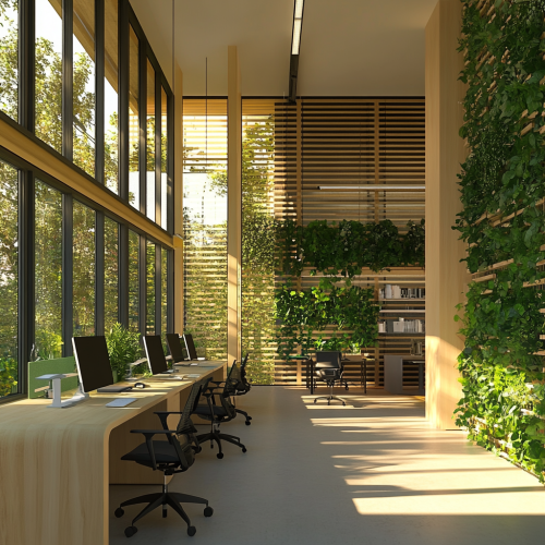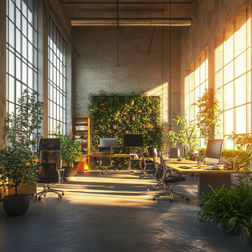 a single room of office, with central open space, greenary in the interior courtyard, loose working office environment, windows on the left side, a passive solar shading green wall on the right side, show it as a sunny day afternoon, close to sunset time