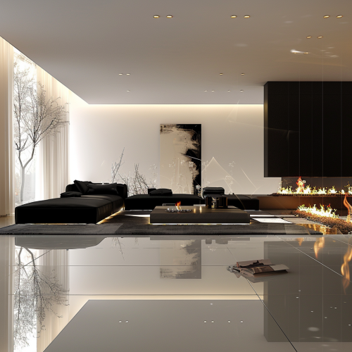 a big empty beige room, long black sofa, white sofa, low table, lots of lights coming down from the ceiling, snowy landscape, morning, super high definition, high contrast, high quality steel, background, vivid and vibrant bright light, The flames of the fireplace dance and flicker with mesmerizing grace.v 6.0