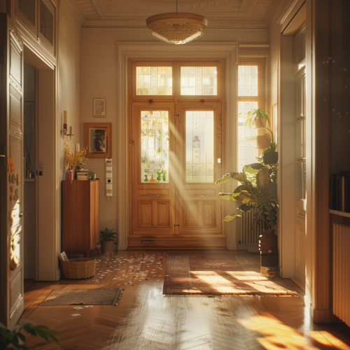 A 45 years old couple::5 entering their apartment, holding open an main door::5 camera is in appartment hall facing the main doors::5 interior bright in scandinavian style--s 250 --style raw --ar 16:9 --s 250