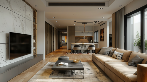 Premium interior space of a modern building, the photo should show a spacious and bright living room with floor-to-ceiling windows. The interior decoration style is mainly modern and simple, and the furniture is neat and comfortable, adding to the warmth of home and highlighting the high-end living choice
