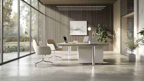 A sleek, modern office space with minimalist furniture and metal paneling, showcasing the latest in contemporary workspace design trends. The open floor plan features a neutral color palette with beige and grey tones, creating a sophisticated and calming environment. The client desk, accompanied by chairs and two MacBooks on the table, is central to the design, while the metal paneling adds a modern industrial aesthetic. The space feels open and airy, with high-end minimalist furniture enhancing its functional yet stylish atmosphere. Large floor-to-ceiling windows allow natural lighting to flood the room, emphasizing the sleek, professional tone. Photographed in the style of architectural photography typical of Shutterstock, Getty Images, or Unsplash, the image captures the essence of contemporary office design. --ar 16:9 --q 2 --style raw --v 6.1 --s 50