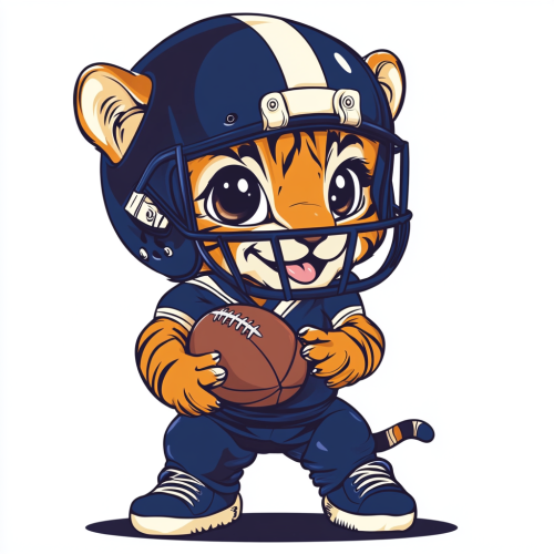 a vintage 80s style graphic of a tiger cub wearing a navy blue football helmet. Full body. He is holding a football. He is wearing a navy football uniform. Cute. Flat white background. Retro. 80s.