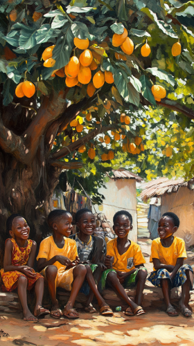 create some teenage boys and girls sitted under a mango tree inside a market, dressed in african attires, laughing, in a typical nigerian igbo village, --ar 9:16
