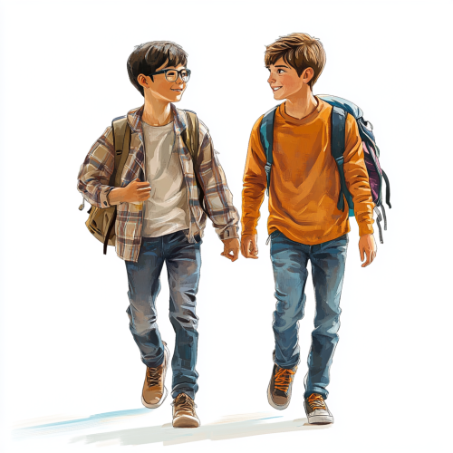 Two teenager boys walking together, boy 1: Asian/Chinese boy with glasses and has casual clothes on, boy 2: southern European boy with brown hair and cool casual clothes, realistic image, white background