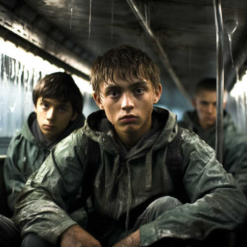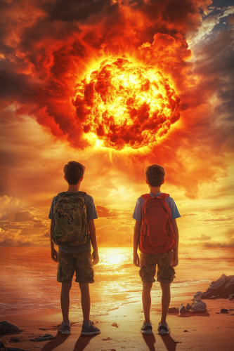 realistic colorful Illustration, photorealistic two teenage boys 13 years old with a tourist backpack in post-acalyptic picture of a nuclear explosion, --ar 2:3