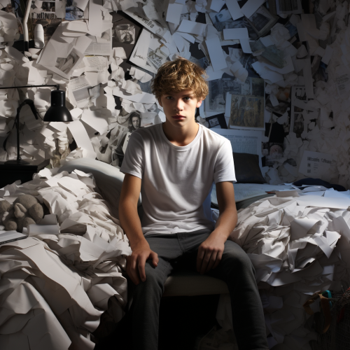 a 1980s teenage boys bedroom, a electric guitar on the floor. lots of band posters on the wall. there's a computer on a desk and a small vintage TV with video game console and remotes. there are clothes on the floor and an old pizza box. A few scattered records and a record player on top of a bookcase. there is a big window with trees outside. screen print art style, minimal colors. --ar 3:4