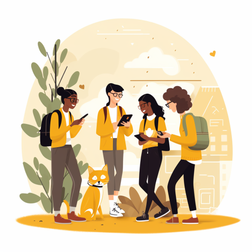 3 university school student gathered around looking at a phone, gaining deeper understanding of the campus through chatting with a storytelling girl with a fox, clean simple character style, cheerful yellow color palette