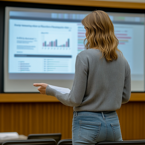The back of a beautiful woman in a gray cardigan and jeans making a ppt presentation in a university classroom, and various statistical graphs appear on the ppt screen. nikon 100mm