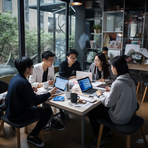 6 Chinese university students working together in the office to carry out a digital marketing campaign ...
