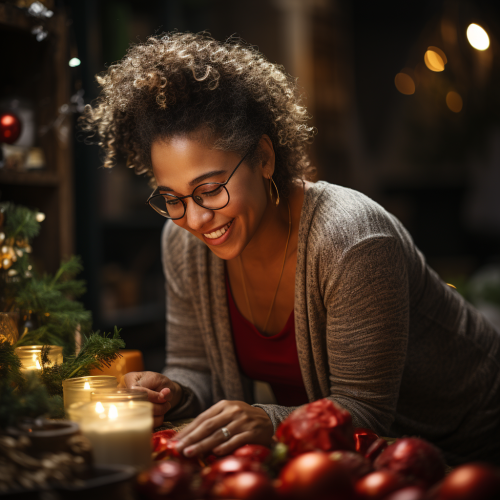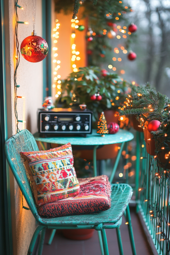 Illustrate a balcony decorated in a retro style for Christmas, with bold colors and vintage ornaments. Metal chairs are painted in cheerful hues and cushioned with patterned throws, while a small table holds a retro-style radio playing classic Christmas tunes. The railing is strung with lights and classic bulb ornaments, casting a festive glow on the outdoor setting. Potted plants are decorated with small, colorful baubles. This outdoor space should be vibrant and inviting, offering a fresh take on holiday decor. Neat and organized. Camera: DSLR - Canon EOS 5D Mark IV. Lens: Canon EF 24-70mm f/2.8L II USM. Composition: Wide shot, room-centered, horizontal orientation, balance between furniture and space. Film: Digital, high resolution, color profile sRGB. Camera settings: ISO 400, f/2.8, 1/60 sec. --ar 2:3 --v 6.1 --s 250