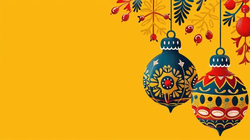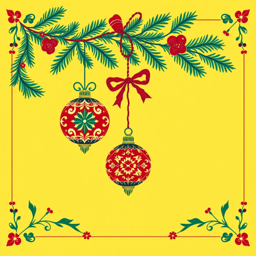 Yellow background with two hanging Christmas ornaments, traditional folk art motifs, and decorative borders. A festive design for holiday cards or packaging. The yellow color is vibrant and adds warmth to the scene. It creates an atmosphere of joy and celebration in the style of Sarah Andersen. --ar 16:9 --s 250 --v 6.0