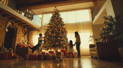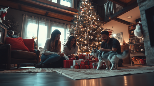 It is a beautiful Christmas celebration. At a Mexican modern house. With a beautiful big Christmas tree and a lot of Christmas gifts. A happy modern Mexican Family is opening gifts. There is mom, dad, a girl and two guys. There is a happy strong Husky playing around the family and a happy tabby cat playing. Christmas vibes. Full shot photo. Full scene. Ultra wide photo. 16 mm lens. Magazine photo. Cinematic. Stock photo style. Photo direction. Art direction. --ar 16:9
