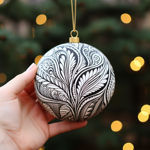 create a simple black and white line drawing of a string of christmas ornaments hanging, mid century modern aesthetic, sketchy style --ar 2:1