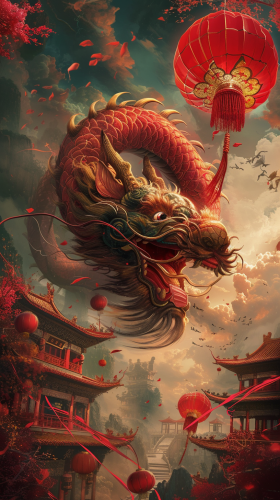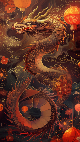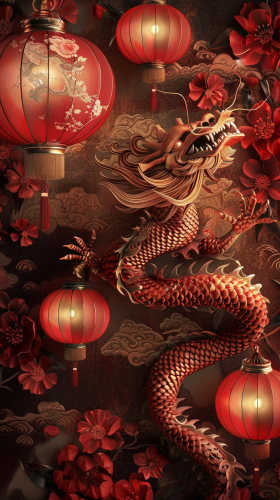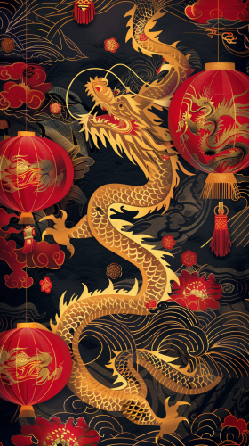 A vibrant Chinese New Year wallpaper design featuring traditional red and gold lanterns hanging gracefully, interwoven with an elegant, serpentine dragon that winds across the scene. The background is adorned with intricate Chinese patterns, including waves, clouds, and floral motifs, all rendered in rich shades of red, gold, and black. The dragon is detailed with golden scales and expressive eyes, exuding power and grace, while the lanterns softly glow, casting a warm, festive light. The entire composition exudes a sense of celebration, tradition, and prosperity --ar 9:16 --v 6.0