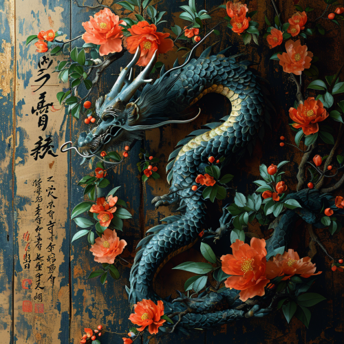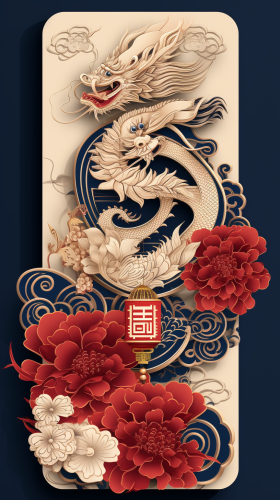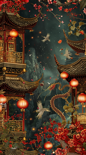 A highly detailed and realistic Chinese-themed wallpaper featuring traditional elements such as glowing red lanterns, intricate gold patterns, blooming cherry blossoms, and majestic dragons. The design should create a sense of depth and dimension, with some elements appearing closer and others receding into the background. Rich colors like deep reds, shimmering golds, and vibrant greens should dominate the palette. The wallpaper should evoke the elegance and grandeur of Chinese art, with a visually immersive quality that brings the cultural motifs to life in a three-dimensional, realistic style --ar 9:16 --v 6.0