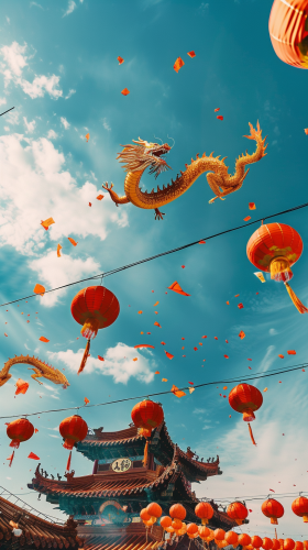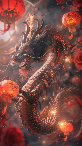 A dynamic and visually immersive Chinese New Year wallpaper design featuring a three-dimensional effect, where red and gold lanterns glow softly, casting realistic shadows. A majestic, well-proportioned dragon with detailed scales, powerful limbs, and sharp claws winds across the scene, creating a sense of movement and grandeur. The dragon's body is muscular and perfectly balanced, with its claws and limbs in a natural, powerful stance. Surrounding the dragon are intricate Chinese patterns, including clouds and floral motifs, all rendered in rich, vibrant colors that enhance the depth and dimensionality of the design --ar 9:16 --v 6.0