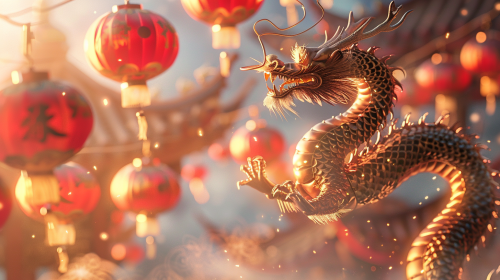 A dynamic and visually immersive Chinese New Year wallpaper design featuring a three-dimensional effect, where red and gold lanterns glow softly, casting realistic shadows. A majestic, well-proportioned dragon with detailed scales, powerful limbs, and sharp claws winds across the scene, creating a sense of movement and grandeur. The dragon's body is muscular and perfectly balanced, with its claws and limbs in a natural, powerful stance. Surrounding the dragon are intricate Chinese patterns, including clouds and floral motifs, all rendered in rich, vibrant colors that enhance the depth and dimensionality of the design --ar 16:9 --v 6.0