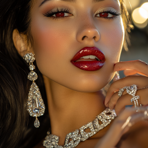 A close-up, high-fashion portrait of a California Latina, super high, exuding a sense of luxury and elegance. Her eyes red, with a dreamy, euphoric expression, subtly smiling as she enjoys the effects. She wears extravagant jewelry--sparkling diamond earrings, layered gold necklaces, and a bold, jeweled ring on her hand, which delicately rests near her face. Her makeup is flawless and glamorous, with shimmering eyeshadow and bold red lips. Her hair is perfectly styled, cascading in soft waves over her shoulders. She's dressed in a luxurious, silk designer gown, the fabric catching the light just right. The lighting is soft and flattering, illuminating her high cheekbones and highlighting the details of her jewelry and outfit. Shot with a Canon EOS 5DSR in portrait mode, the image captures sharp, high-definition details of her skin, jewelry, and makeup, with a shallow depth of field that softly blurs the background, focusing entirely on her glamorous, high state. The overall mood is sophisticated, chic, and effortlessly stylish
