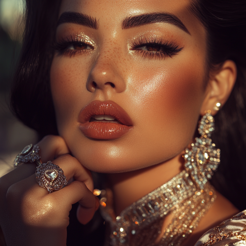 A close-up, high-fashion portrait of a California Latina, super high, exuding a sense of luxury and elegance. Her eyes are half-closed, with a dreamy, euphoric expression, subtly smiling as she enjoys the effects. She wears extravagant jewelry--sparkling diamond earrings, layered gold necklaces, and a bold, jeweled ring on her hand, which delicately rests near her face. Her makeup is flawless and glamorous, with shimmering eyeshadow and bold red lips. Her hair is perfectly styled, cascading in soft waves over her shoulders. She's dressed in a luxurious, silk designer gown, the fabric catching the light just right. The lighting is soft and flattering, illuminating her high cheekbones and highlighting the details of her jewelry and outfit. Shot with a Canon EOS 5DSR in portrait mode, the image captures sharp, high-definition details of her skin, jewelry, and makeup, with a shallow depth of field that softly blurs the background, focusing entirely on her glamorous, high state. The overall mood is sophisticated, chic, and effortlessly stylish