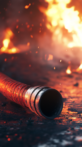 photorealistic wallpaper featuring a close-up of a fire hose laying on the ground, with flames flickering nearby, smoke billowing in the background, highlighting the intensity of a fire scene, vibrant colors and textures, 4k resolution --ar 9:16