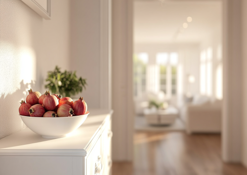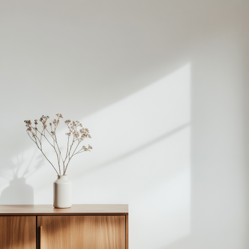 A close-up shot of a white hallway wall, focusing on a rectangular section where the wallpaper can be inserted. A narrow console table with a few minimal decor pieces, like a single book or a geometric sculpture, is partially visible in the background, subtly blurred to maintain focus on the wallpaper. The soft lighting accentuates the wallpaper’s design and texture, creating a clean and modern aesthetic.