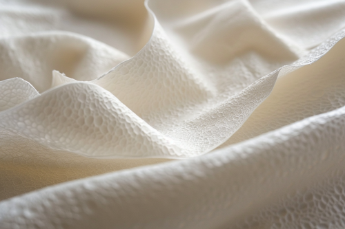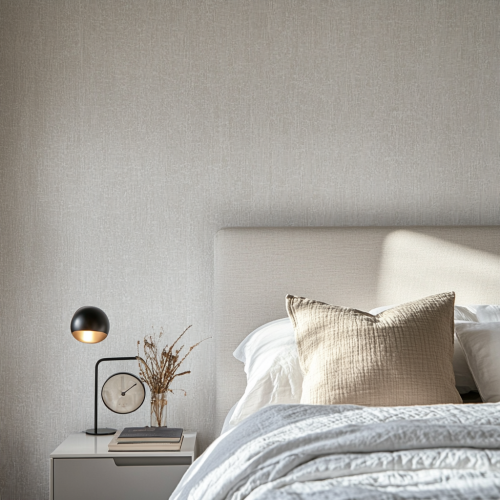 A highly focused close-up of a white wall in a bedroom, with a central area for wallpaper display. The wall dominates the image, with the edge of a plain, neutral-colored headboard slightly visible and out of focus at the bottom. There are no other elements or distractions, and the lighting is soft and even to enhance the wallpaper’s details against the white wall.
