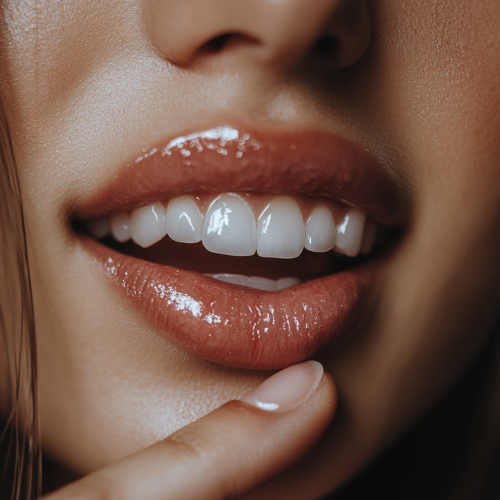 A close-up photo focusing exclusively on a person's mouth, ensuring the nose is not visible. The image shows a round and full lip shape, with the lower lip slightly pulled down by a finger placed in the center, exposing both the upper and lower teeth clearly. The upper and lower lips have a glossy finish, giving them a shiny and moist appearance. The teeth are perfectly white and clean, without any decorations or tooth gems. The expression is neutral, with no smile, allowing the lips to maintain their natural, round shape. The skin around the lips is smooth and healthy-looking, reflecting a natural, hydrated appearance. The focus is solely on the lips and teeth, with the finger pressing down on the center of the lower lip to create a symmetrical, direct view of the mouth. A dark background is used to emphasize the brightness and clarity of the lips and teeth. The skin tone is similar to the East Asian complexion shown in the reference imag - Image #4