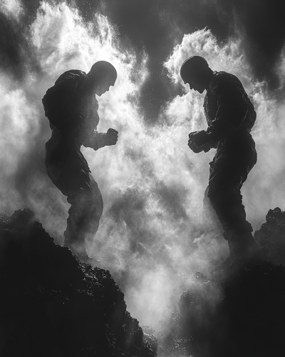 two people at war fighting each other punches flying, high contrast backlit desaturated extreme close-up on face and body 400mm photorealistic hyper realistic --ar 4:5 --s 750 --style raw
