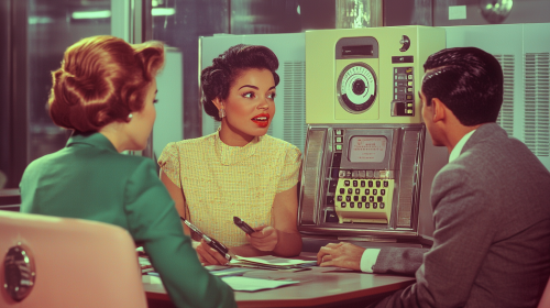 vintage photograph of 1950s retro-futuristic office scene with discussion between two women, one black and one white, and a Mexican American male with conversation callout icons above them. Show people in classic 1950s business attire in varied poses of animated discussion, with ethnic diversity represented across the group. Include futuristic devices like a microphone with typewriter keys or a rotary dial connected to the screen. Vintage design elements like pastel colors, metallic finishes, and soft, glowing lights would enhance the scene’s retro-futuristic look., --v 6.1 --ar 16:9 --q 2