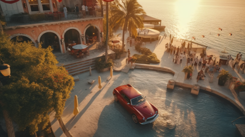 Aerial collage showing diverse luxury niches: a high-end Airbnb villa by the beach with a private pool, a dynamic car race on a track with speeding sports cars and cheering crowds, and a glamorous outdoor party scene at sunset with guests enjoying the ambiance. Use Canon EOS R5, 35mm lens, cinematic lighting, photorealistic, high detail, --ar 16:9 --v 5.0 --stylize 1000