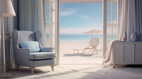 Photorealistic william egelston style, Detalles de una oficina en un hotel de lujo en la playa , femenino colores beige gris azul --ar 16:9