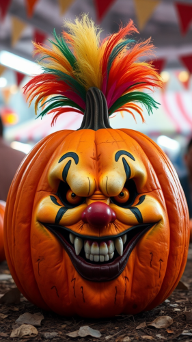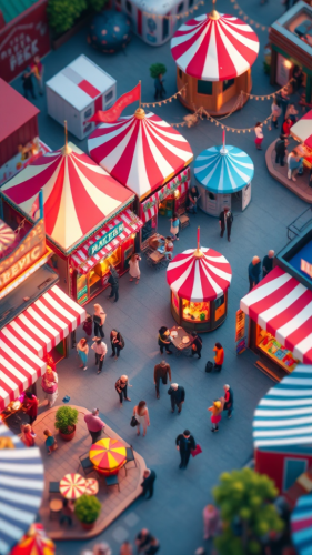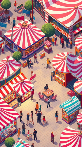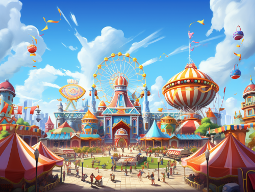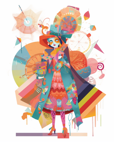 Illustrate a charming, whimsical character in a colorful, patchwork costume with oversized accessories, set against a backdrop of a fantastical carnival with whimsical rides. --v 5.0 --ar 4:5