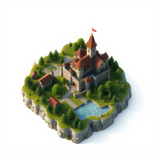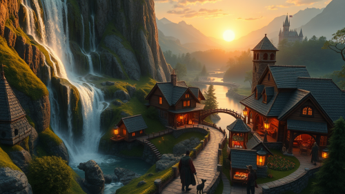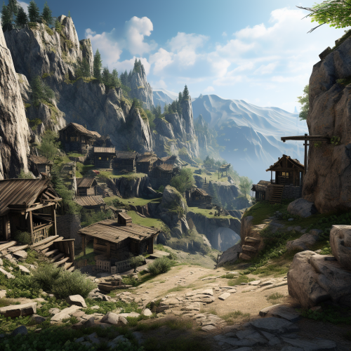 medieval village that was destroyed by a landslide and collapsed fell into the gorge from the top of the hill, AAA video-game, 3d