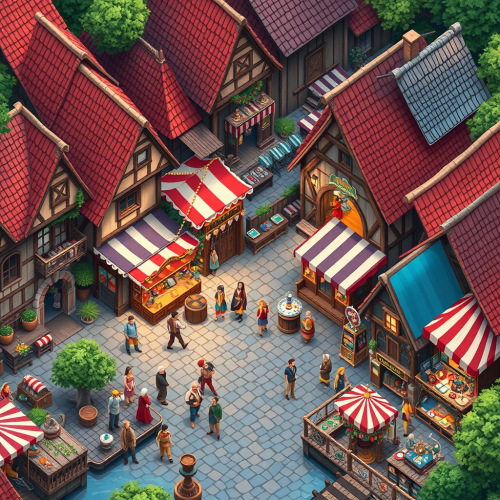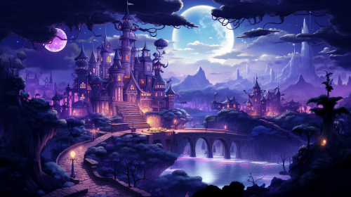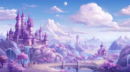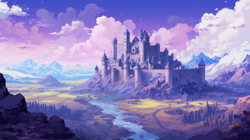 cute bright colorful purple pixel art fantasy medieval village in the daytime --aspect 16:9