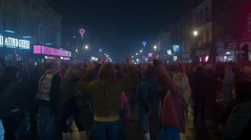 In the carnival procession are dancing people and musicians. All the people are dressed in brightly colored clothes in bright patches of paint. The scene unfolds on a city street at night, lanterns shine brightly, creating a contrast of light and shadow. the asphalt on the street is wet after the rain, in the puddles are reflected bright ceta. --ar 16:9 --c 14 --s 980 --style 2R2YPCL8uRmuKJahCMpQpkANaECsV2JVNIAQHnTr0Y --v 5.2