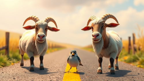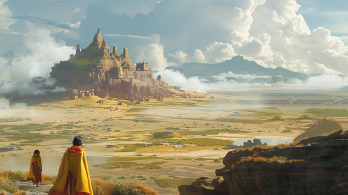 A 3D animated cartoon-style scene of a vast desert landscape with an ancient village in ruins in the distance. In the foreground, a few characters dressed in worn, simple robes wander aimlessly, their expressions reflecting a sense of loss. The sky is filled with heavy clouds, creating a soft, overcast atmosphere that adds to the feeling of abandonment. The animation style is similar to *Moana*, with vibrant colors, smooth textures, stylized character features, and soft lighting effects. Created Using: animated movie-inspired character design, cell-shading techniques, diffused light rendering, vibrant landscape detailing, and dynamic depth of field, hd quality --ar 16:9 --v 6.0