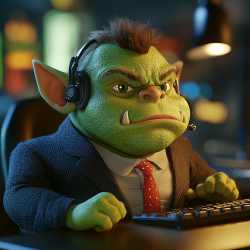 green orc child dressed suit working in a call center, looking forward, pixar theme, 3d, render, 3d pixar, funny texture, beautiful colors, hue saturation, many colors, funny scene, zoom face