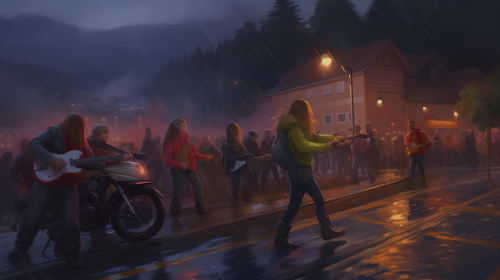 The carnival procession is dancing along the night street, musicians are walking along with them, everyone is dressed in bright clothes with bright spots of paint on their clothes. The scene takes place on a night street brightly lit by lanterns. On the asphalt puddles after the rain in these puddles brightly reflects the whole scene. The carnival atmosphere captures everyone present, the setting is imbued with exciting energy. painting style by tony taka --ar 16:9 --c 10 --s 980 --style 2R2YPCL8uRmuKJahCMpQpkANaECsV2JVNIAQHnTr0Y --v 5.2