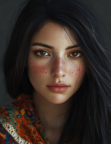 Photorealistic young woman, Day of the dead catrina, long hair, red, gold, blue, black and white, looking straight on, natural light, --ar 2588:3375 --q 2 --v 6.1