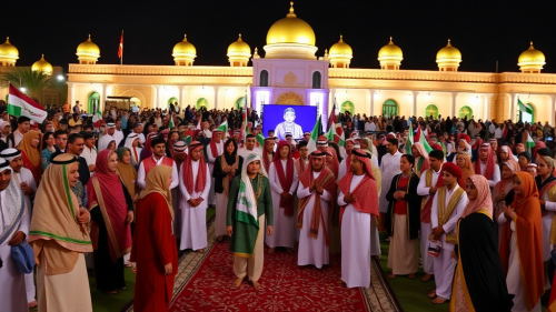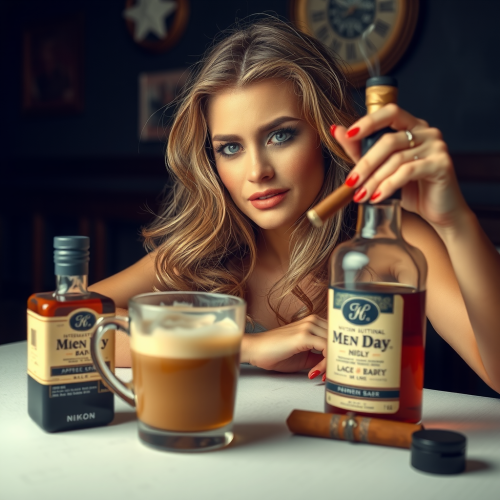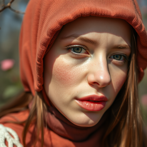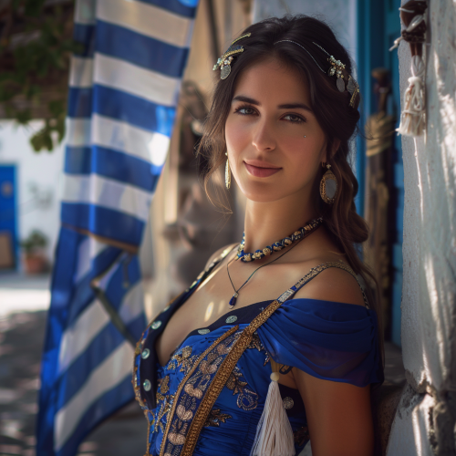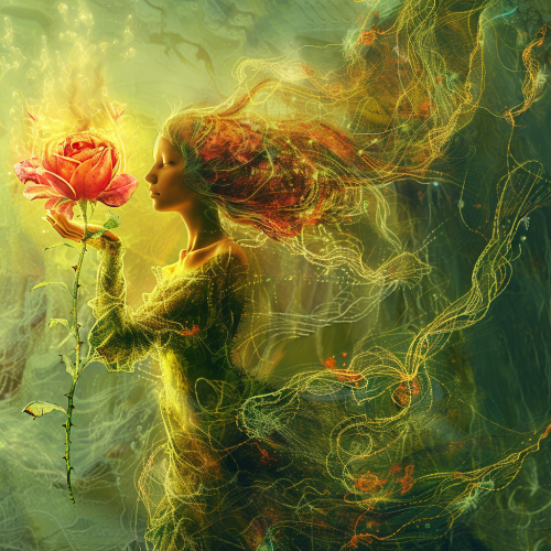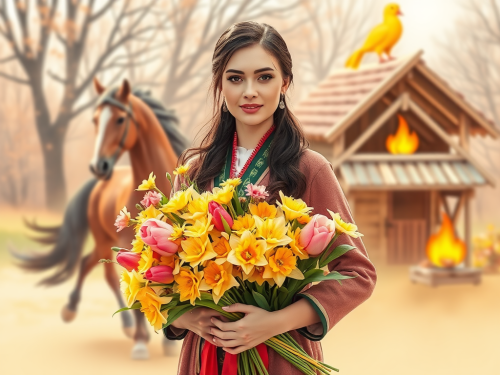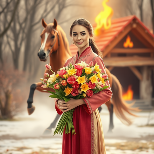 Create an image for International Women's Day (March 8th) inspired by the Russian saying "She can stop a galloping horse and enter a burning hut." A beautiful and strong woman stands confidently in the foreground, holding a large, bright bouquet of spring flowers like tulips, daffodils, and mimosa, symbolizing tenderness and celebration. In the background, there is a galloping horse and a stylized burning hut with gentle flames. She wears an elegant yet practical outfit, perhaps incorporating elements of Russian national costume, highlighting her femininity and strength. The image has a bright, festive style with a fairy-tale touch, using warm colors such as gold, pink, red, and green. Her expression exudes confidence and grace, and the overall image should inspire admiration, respect, and a sense of celebration.