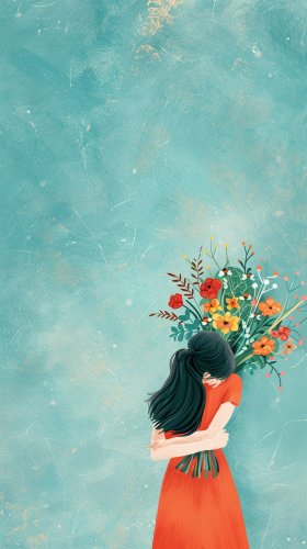 symbols of international women's day, wide copy space, a woman is hugging a bouquet, turquoise background --ar 9:16 --v 6.0 --style raw