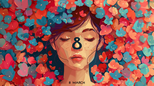 poster, placard, Create illustrations that showcase the diversity of women in various skin colors and different hair styles, celebrating their achievements on International Women's Day, illustration, design. Text "8 of March" --ar 16:9 --v 6.0 --s 750