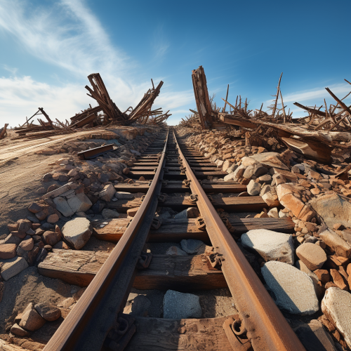 a grunge watercolor, runny paints, a ghostly train on a never-ending railroad track, vanishing point, gloomy, atmospheric, Highly detailed --ar 3:4 --stylize 500