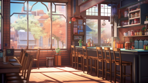 anime coffee shop, bar, cozy, single modern arch window, bright wall, clean, anime style --ar 16:9