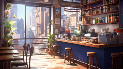 narrow anime coffee shop, bar, cozy, modern arch window, clean, anime style --ar 16:9