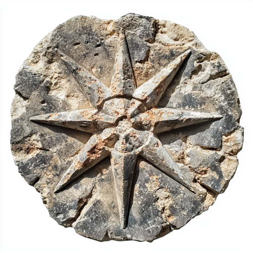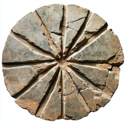 photo of an ancient stone disc with many star points and long pointed details coming from a large gap in the center. The ancient stone is broken. Flat photo, white background
