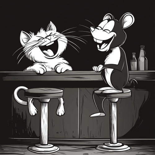 a cartoon style cat and a cartoon style mouse sitting together at a bar. they are sitting on bar stools and are laughing. black and white illustration.