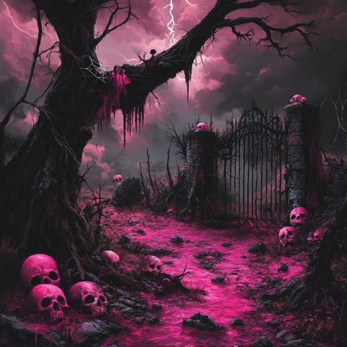 a hot pink forest with a creepy, eerie aesthetic. there are skulls & jack-o-lanterns on the ground near trees, the trees are black with spiderwebs and hot pink goo dripping from the branches. there is an old metal gate in the forest's entrance with a very haunting vibe. the aesthetic is very dark with dark clouds, stormy weather and lightning