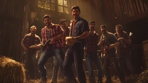 In the protagonist’s imagination, a group of rugged farmers stands around an old, dimly lit barn. They are holding weapons and bundles of drugs, laughing and celebrating. Their faces are hard and rough, dressed in old flannel shirts and dirty jeans. In the background, bales of hay and old farm equipment are barely visible in the shadows. The atmosphere is tense and gritty, with a dark, sinister edge to the celebration, as if something dangerous and illegal is taking place. --v 6.1 --ar 16:9