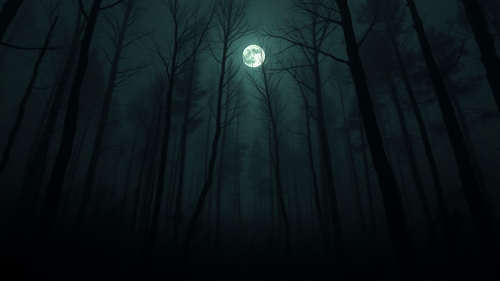 A photorealistic image of an ancient evergreen forest floor. Night time. Light fog. Creepy vibes. Reminiscent of a film still inspired by Wes Anderson and Conor Harrington. The scene is set against a dark, shadowy background, adding depth and intensity to the composition. The image is captured with a 200mm lens, HD quality, at f/2.0, ensuring a highly detailed and accurate representation with a vintage, cinematic feel. --ar 1:1 --stylize 250 --v 6.1